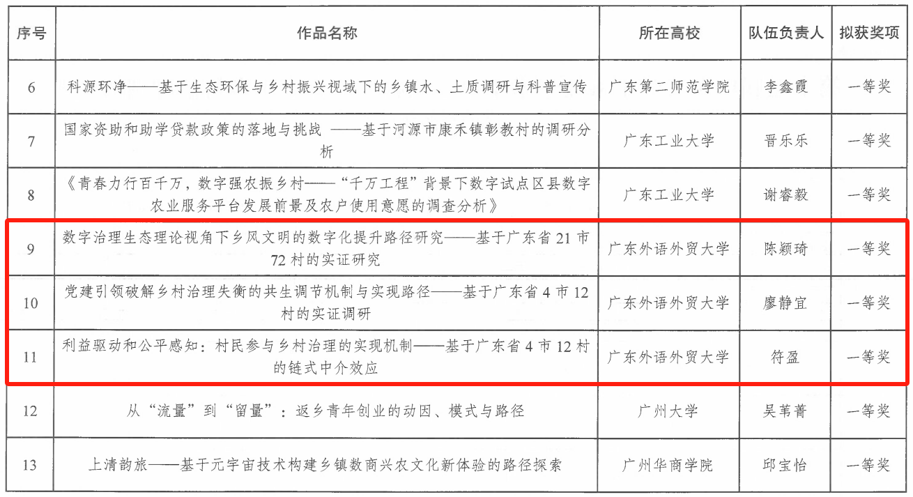 2024年10月13日,第二届广东大学生乡村治理调研竞赛决赛颁奖仪式在我校大学城校区顺利举办。此次大赛由共青团广东省委员会、广东省教育厅、广东省科学技术厅、广东省科学技术协会与广东省学生联合会主办,广东外语外贸大学承办,广东省社会管理研究会协办。我校获一等奖3项,二等奖1项,三等奖3项。其中太阳集团官网学子在老师的精心指导下,获得大赛一等奖3项。