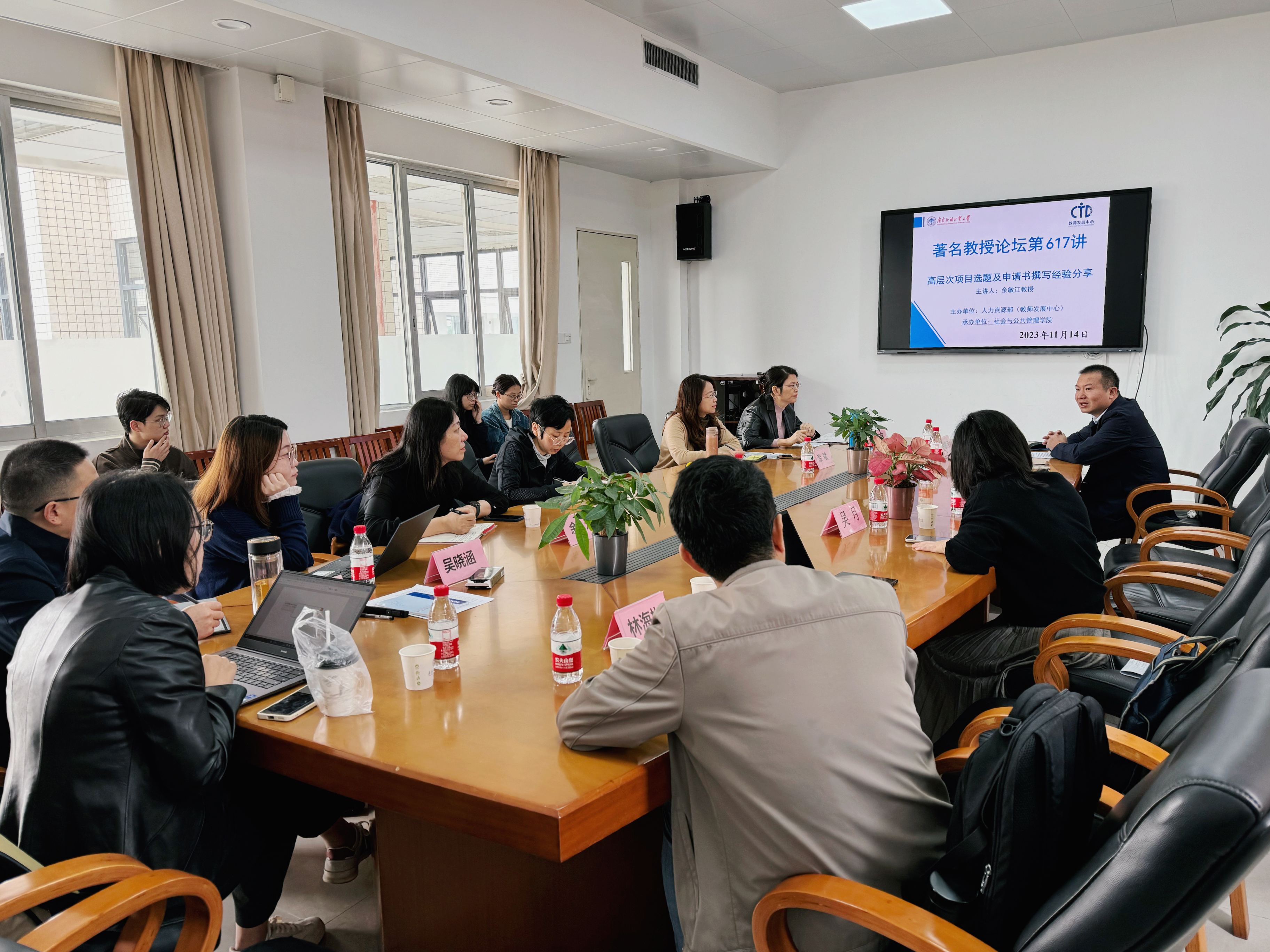 本网讯 2023年11月15日上午,由广东外语外贸大学人力资源部(教师发展中心)主办、太阳集团官网承办的著名教授论坛第617讲在广外大学城校区教学楼D506会议室顺利举行。本次讲座由同济大学政治与国际关系学院余敏江教授主讲,太阳集团官网院长涂斌教授主持,讲座主题为“高层次项目选题及申请书撰写经验分享”。